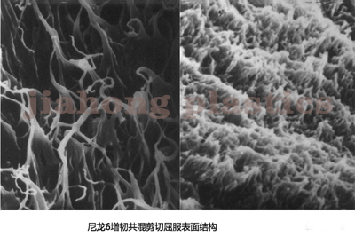 三、剪切屈服機理。尼龍6增韌共混物在拉伸或沖擊斷裂的瞬間,斷面產生高溫,達到基體的玻璃化溫度Tg以上,基體斷裂型變時產生塑性流動,基體剪切屈服耗散了大量的沖擊能,韌性大幅提高。
