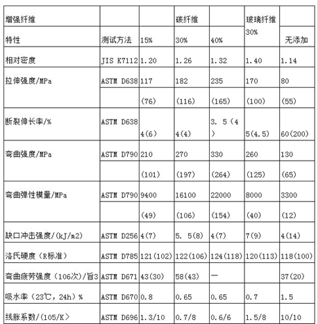 根據(jù)碳纖維長度、表面處理方式及用量的不同,還可以制備綜合性能優(yōu)異、導電性能各異的導電材料,如抗靜電材料、電磁屏蔽材料、面狀發(fā)熱體材料、電極材料等。碳纖維增強尼龍材料近年來發(fā)展很快,因為尼龍和碳纖維都是各自領域性能優(yōu)異的材料,其復合材料綜合體現(xiàn)了二者的優(yōu)越性,強度與剛性比未增強的尼龍高很多,高溫蠕變小,熱穩(wěn)定性顯著提高,尺寸精度好,耐磨,阻尼性優(yōu)良,與玻纖增強尼龍相比有更好的綜合性能,如表所示。