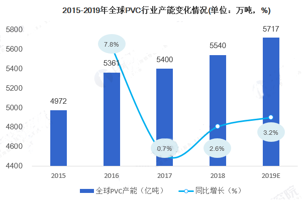 根據IHS數據,2018年全球PVC生產能力為5540萬噸,而在2019年,全球PVC生產能力約為5717萬噸。