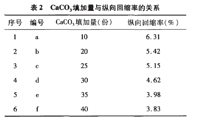 (2)配方中填料的填加量影響較大,以CaCO3的填加量作分析,隨CaCO3的填加量增加管材的縱向回縮率在減小,隨著CaCO3的填加量到一定值時,CaCO3的填加量不再是影響管材縱向回縮率的主要因素。