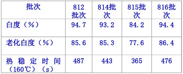 4個批次料的白度、老化白度及熱穩(wěn)定時間的測試結果如表1所示。