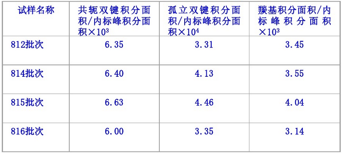 由表3可知:4個批次樣品的分子質(zhì)量接近,分子質(zhì)量分布基本一致,沒有明顯差異。由此可知,第815批次料色澤較差與分子質(zhì)量及其分布無關。